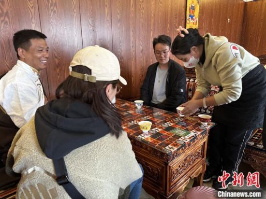 資料圖為長江源村的一家藏餐吧迎來客人。 中新社記者 李雋 攝