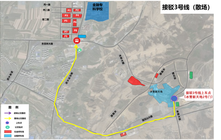 1號(hào)門(mén):出園游客在冰雪新天地1號(hào)門(mén)(天健路公交車(chē)臨時(shí)站點(diǎn))乘坐接駁2號(hào)線公交車(chē)返回地鐵霧開(kāi)河大街站B口,換乘停車(chē)場(chǎng)擺渡車(chē),返回臨時(shí)停車(chē)場(chǎng)。(如下二圖)