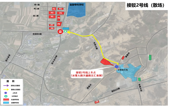 乘坐地鐵2號(hào)線在霧開(kāi)河大街站C口出站,換乘接駁1號(hào)線公交車(chē),前往冰雪新天地1、2號(hào)門(mén)。(如下圖)