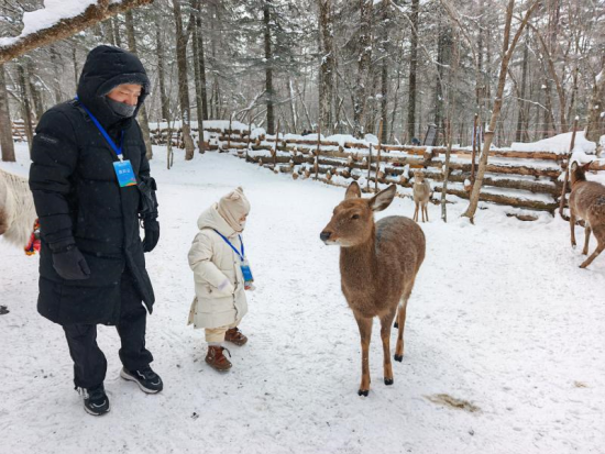 行至景區(qū)中心處的“粉雪部落”,濃郁的東北風情撲面而來!爸侨⊥⑸健敝黝}場景成了最熱鬧的打卡點,歡聲笑語不斷。鹿園里,孩子們輕輕撫摸馴鹿、喂食苔蘚,體驗著與森林精靈親近的樂趣!霸谀戏綇臎]見過真正的馴鹿,這種體驗太難得了”,來自云南的段先生一邊錄制視頻,一邊準備向家人“炫耀”這份難得的美好。