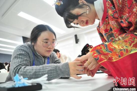 1月23日,巫珮瑄(左)在吉林長(zhǎng)春學(xué)習(xí)制作漢服手工仿絨花雪花胸針!