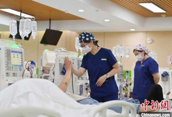 5月9日,長春中醫(yī)藥大學(xué)附屬醫(yī)院腎病科門診透析室內(nèi),護士在為患者加油打氣!埇 攝