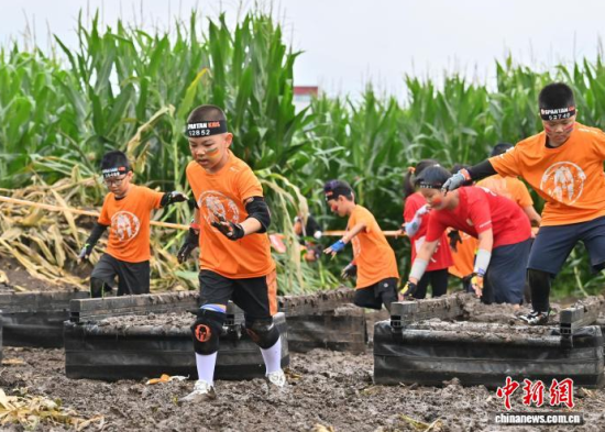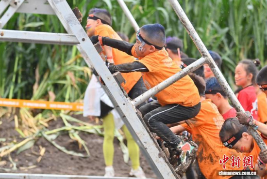 7月25日,2025斯巴達(dá)勇士?jī)和愰L(zhǎng)春站在卡倫湖力旺實(shí)驗(yàn)學(xué)校開賽。當(dāng)天大雨傾盆,參賽的小選手們熱情不減,紛紛化身“小勇士”,在泥濘的賽道上勇闖障礙、攀爬坡道。圖為參加斯巴達(dá)勇士?jī)和惖倪x手在比賽中。中新社記者 張瑤 攝