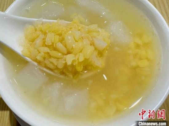 “世界糖水在中國,中國糖水在廣東!睂V州人而言,在炎熱的夏日或寒冷的冬夜,與好友相約糖水鋪,“食”上一碗滋補的糖水,甜蜜就能讓整個人“充滿電”。圖為馬蹄綠豆爽。 中新社記者 王堅 攝