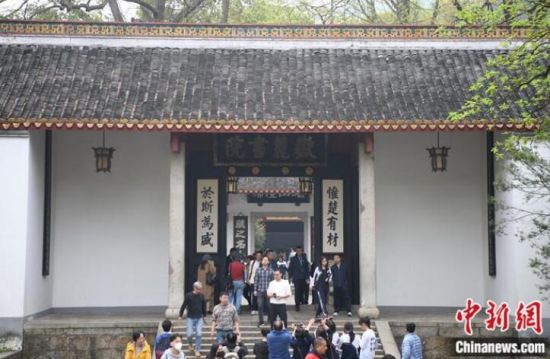 岳麓書院大門有一副集句聯(lián),上聯(lián)是“惟楚有材”,源自《左傳》;下聯(lián)是“于斯為盛”,出自《論語》。圖為3月30日,岳麓書院人來人往。(資料圖片) 中新社記者 楊華峰 攝
