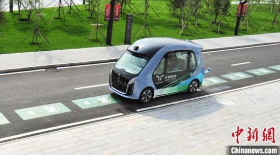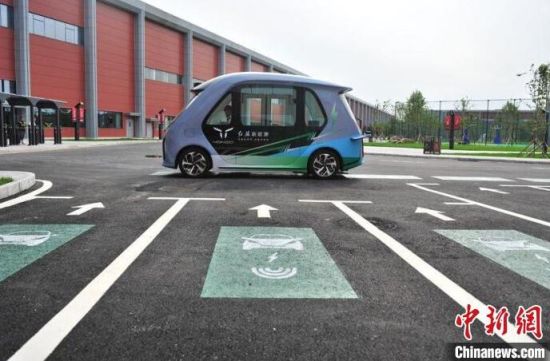 一輛新能源電動(dòng)車(chē)駛過(guò)高功率動(dòng)態(tài)無(wú)線(xiàn)充電道路系統(tǒng)的泊車(chē)位。