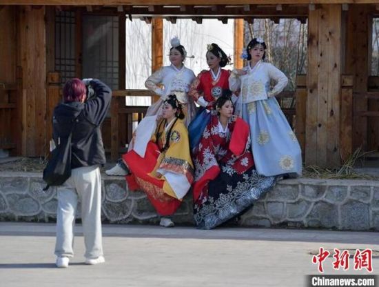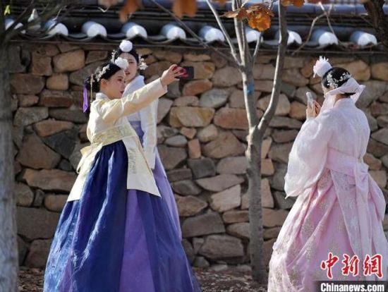 11月4日,在吉林省延邊朝鮮族自治州延吉市的中國朝鮮族民俗園內(nèi),游客身著朝鮮族服飾拍照留念。延邊是中國最大的朝鮮族聚居區(qū),濃郁的民族風情吸引大量游客前來觀光體驗。