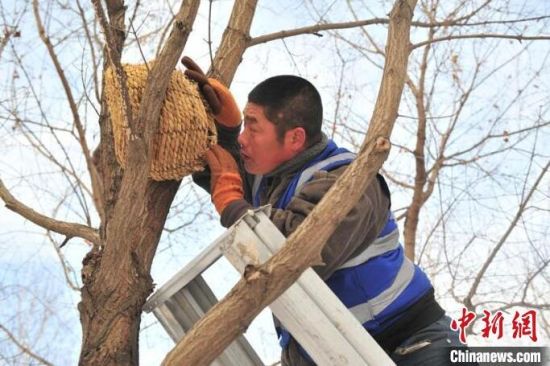 11月23日,趁著雪后天晴,吉林長(zhǎng)春友誼公園的工作人員忙著維護(hù)樹上的草編鳥巢,并投放了鳥糧。該公園生態(tài)環(huán)境好、野生鳥類多,園方已經(jīng)連續(xù)三年在園區(qū)設(shè)置百余個(gè)草編鳥巢助鳥類安全過冬。