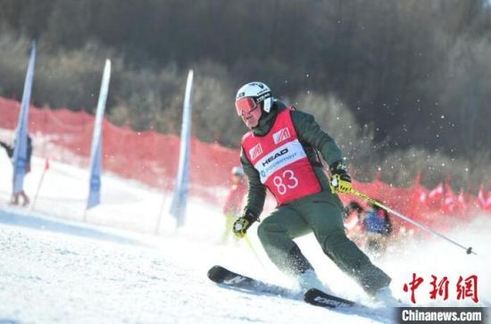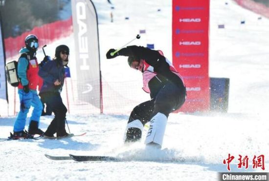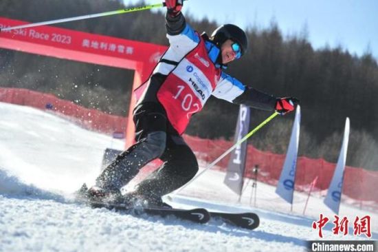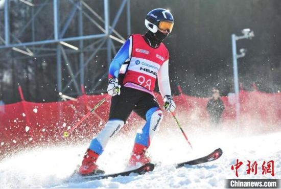 中國(guó)高山滑雪選手沖過(guò)終點(diǎn)。