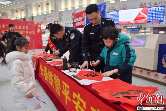 沈陽(yáng)鐵路公安局長(zhǎng)春公安處的民警在為旅客送福字。張瑤 攝