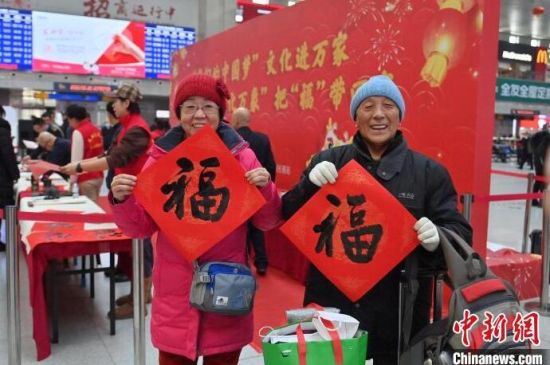 旅客在展示福字。張瑤 攝