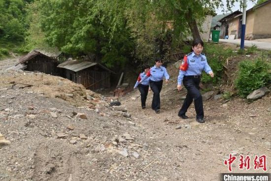 “女子警務(wù)團(tuán)”來(lái)到村里走訪(fǎng)。崔藝琳(右一)說(shuō),轄區(qū)里很多村子道路難行,但從沒(méi)阻止她們前行的腳步!埇 攝