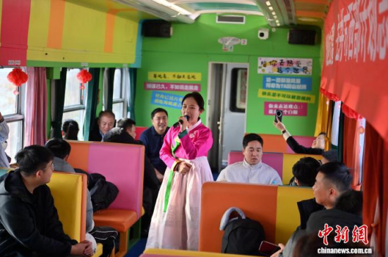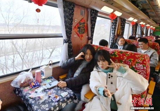 12月3日,直達(dá)長白山的龍井民俗旅游專列鳴笛啟程,開啟冬日樂賞冰雪之旅。該專列融合“冰雪+民俗”雙重主題,每節(jié)車廂各成一道風(fēng)景,絢麗多彩的民俗風(fēng)情貫穿全程。車窗外,壯美的林海雪原不斷掠過,吸引游客觀賞。據(jù)悉,該專列將在每周末往返兩地。中新社記者 張瑤 攝