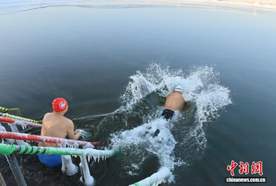 2026年1月1日,在長春南湖公園,冬泳愛好者在湖水中暢游。當天,近百名冬泳愛好者齊聚南湖,以冬泳的方式迎接新年。中新社記者 張瑤 攝