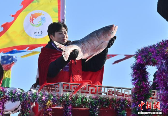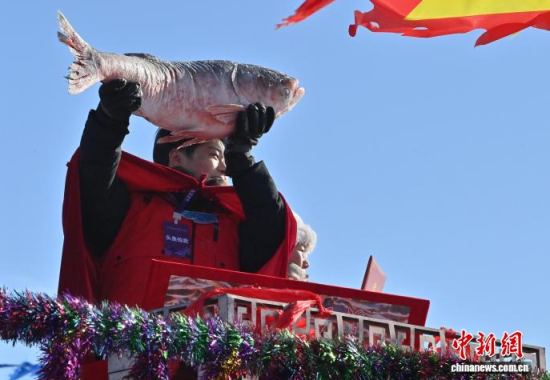 1月8日,吉林·松原查干湖第24屆冰雪漁獵文化旅游節(jié)開幕。當天,在查干湖湖面上舉行的“頭魚”拍賣儀式上,“頭魚”拍出了1699999元人民幣。 中新社記者 張瑤 攝