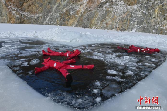 2月5日,吉林省長春市,一項獨特的冰浮項目吸引眾多游客前來體驗。在嚴(yán)寒天氣中,參與者身穿醒目的紅色浮力裝備,悠然漂浮于冰面之上,感受別致的冰雪樂趣。圖為游客在下水前拍照留念。中新社記者 張瑤 攝