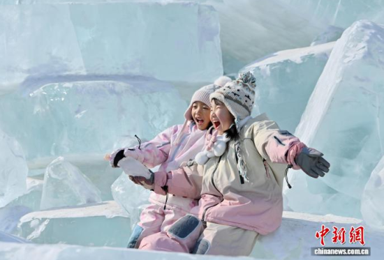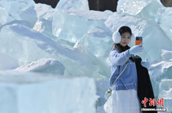 2月9日,在長春凈月潭國家森林公園內,由水庫天然冰塊堆砌而成的“藍冰”景觀,吸引市民打卡拍照。“藍冰”是指致密堅硬的冰,因冰內部空氣被擠掉而變得晶瑩透徹,這時陽光中波長較短的藍光被致密堅厚的冰層散射,冰塊便呈現(xiàn)出水晶般美麗的藍色。中新社記者 張瑤 攝