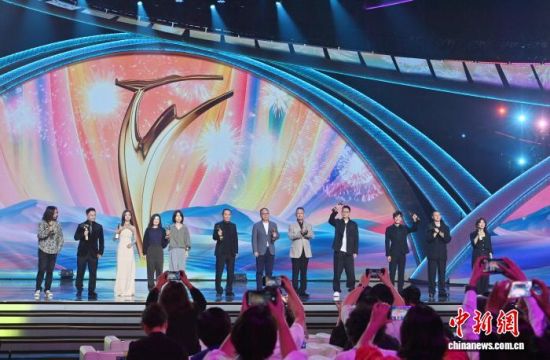 2024年9月1日晚,第十九屆中國(guó)長(zhǎng)春電影節(jié)閉幕式上,獲獎(jiǎng)?wù)呒w合影留念。(資料圖) 中新社記者 張瑤 攝